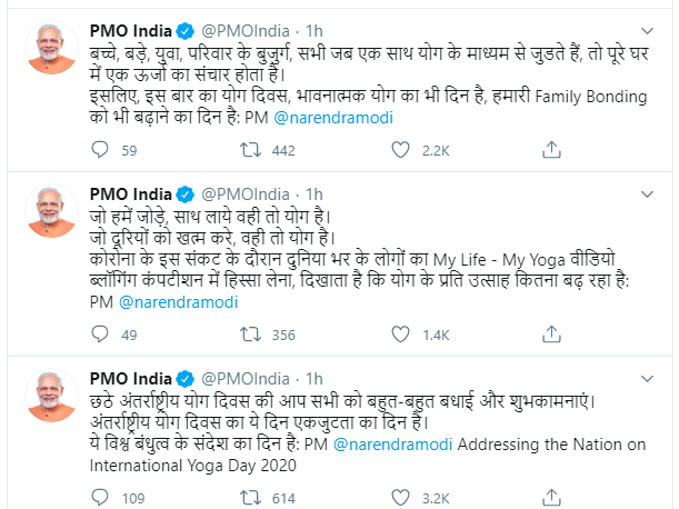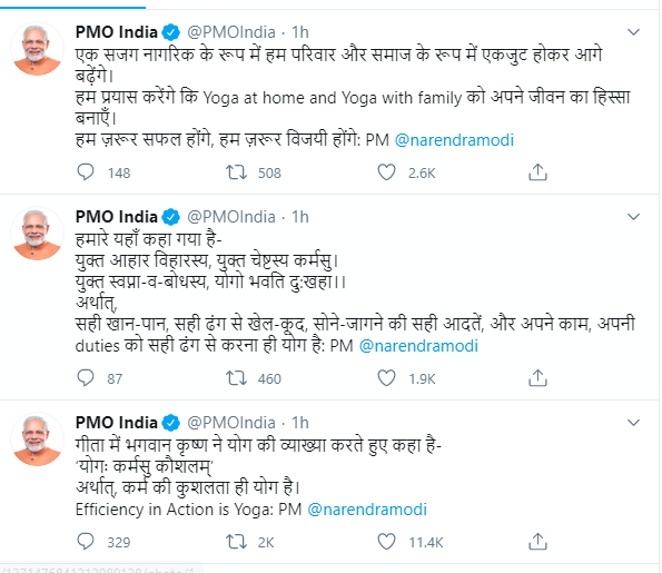 - पीएम मोदी ने अपने संबोधन के दौरान कहा कि एक सजग नागरिक के तौर पर हम परिवार और समाज के रूप में एकजुट होकर आगे बढ़ेंगे। हम प्रयास करेंगे कि 'योगा एट होम और योगा विद फैमिली' को अपने जीवन का हिस्सा बनाएंगे। हम जरूर सफल होंगे। हम जरूर विजयी होंगे।